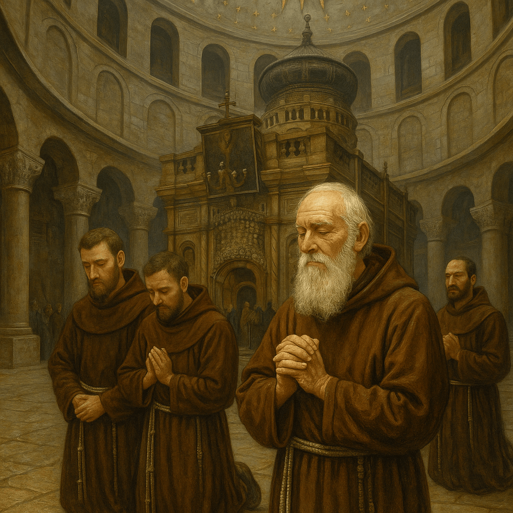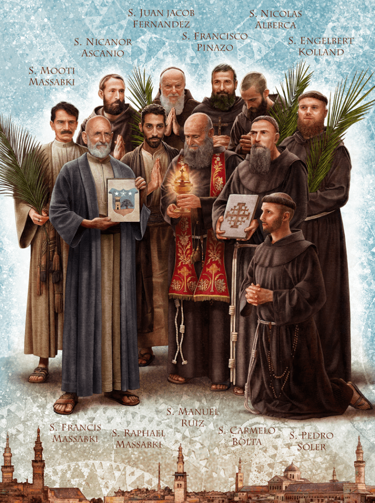 La imagen de los santos Mártires Franciscanos y Maronitas de Damasco (†1860), encargada por la Postulación General OFM con ocasión de la Solemne Canonización del 20 de octubre de 2024, es una obra gráfica del ilustrador Andrea Pucci, a quien se debe, entre otras, el gran ciclo iconográfico de los santos que decora todo el perímetro interior de la iglesia parroquial de los santos Fabiano y Venancio en Roma, barrio Appio.
